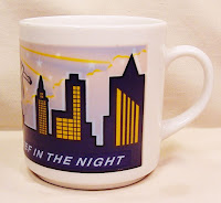 This is the second mug in the set of two I picked up last week. It is also a wrap around design, showing the outline of a city at night with a crescent moon and stars above. In the lower right is the phrase "©LIKE A THIEF IN THE NIGHT"