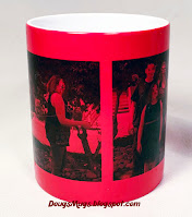 When hot liquid is added to the mug - SURPRISE! The red color fades completely ! This leaves the pictures in full color! This is the new style thermochromic mug, where the entire mug is covered in thermochromic ink. Even the edge of the handle, where it touches the hot mug is turned white by the heat. (Now, honestly, if this were a black mug, the photo would be hidden entirely, but I love this one and it has a special place in the collection and in my heart.)