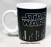 This is another really well designed mug with a full wrap around design. The mug features the logo from the movie series Star Wars on the left and right sides of the mug. All around the bottom edge are the different Light Sabre handles of all the known Jedi Knights and Siths in the Star Wars movies.